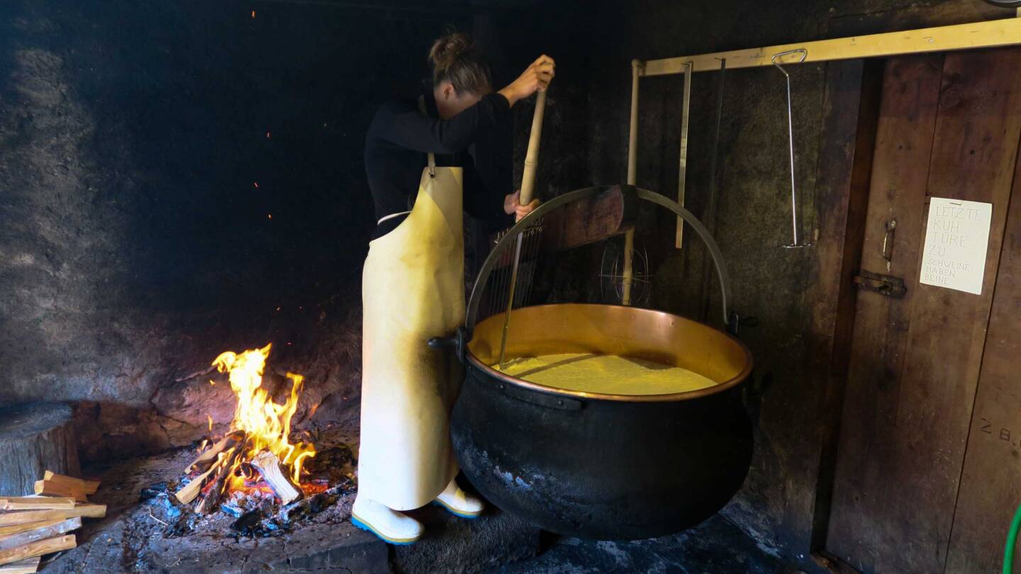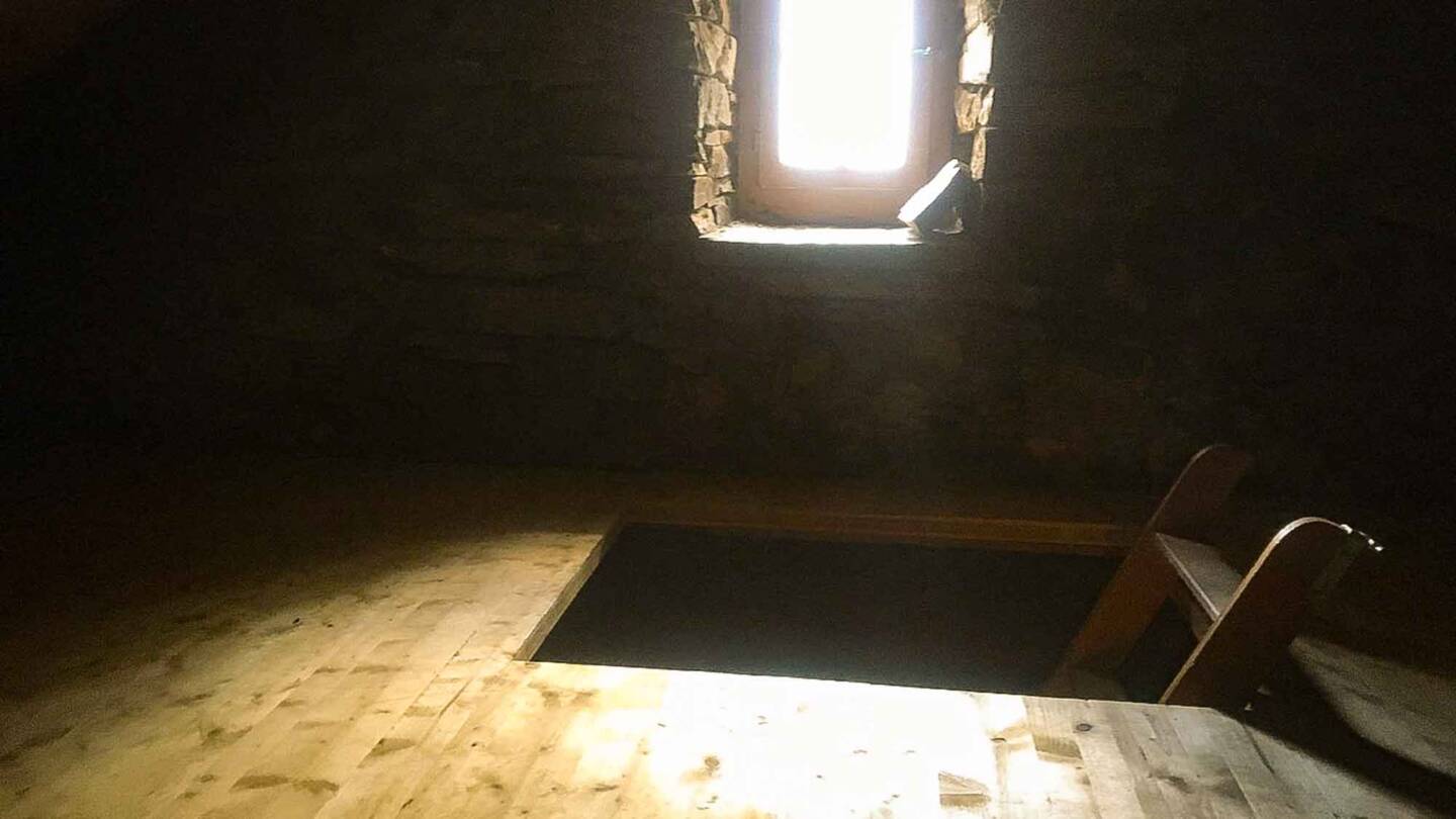 Im innern der Hütte gibts eine grosse, offene Feuerstelle zum käsen und heizen geeignet, einen einfachen Gasherd, Tisch und Stühle und eine Sofa. Über eine Leiter erreichst du den Schlafraum im Obergeschoss. Das Massenlager ist für 4 Personen geeignet. Im Untergeschoss gibts ein WC.